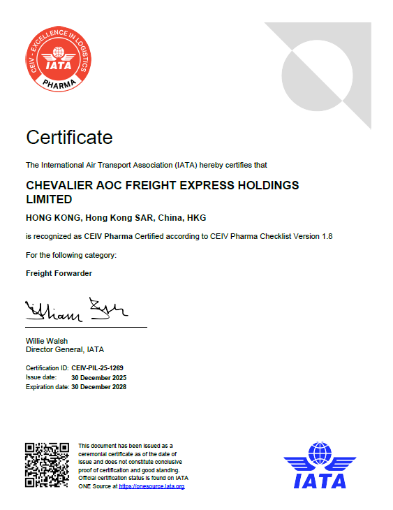 As we move into our 7th year of IATA CEIV Pharma Accreditation, Chevalier AOC Freight Express Holdings Ltd is proud to reaffirm our commitment to delivering safe, reliable, and compliant pharmaceutical and life science logistics worldwide.